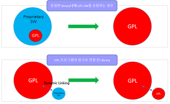 - GPL-2.0 과 결합하여 사용되는 모든 Module 및 Library (GPL과 동일한 Binary, GPL과 메모리 공유 방식하는 SW)
