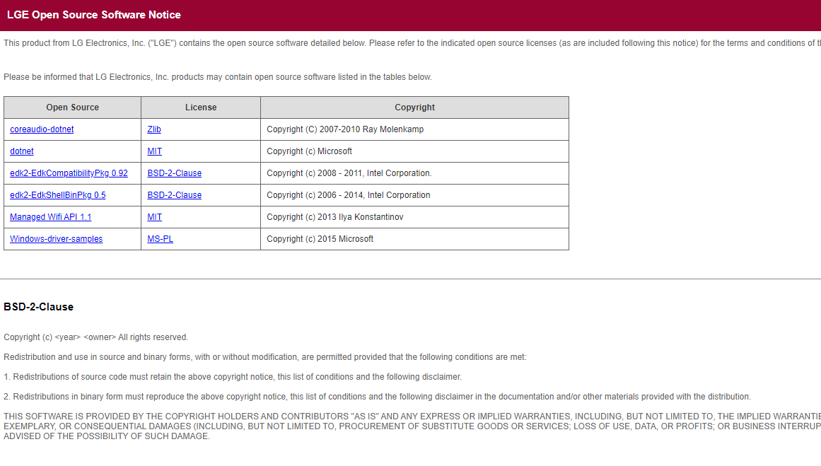 LG전자 오픈소스 고지문(OSS NOTICE) 예시